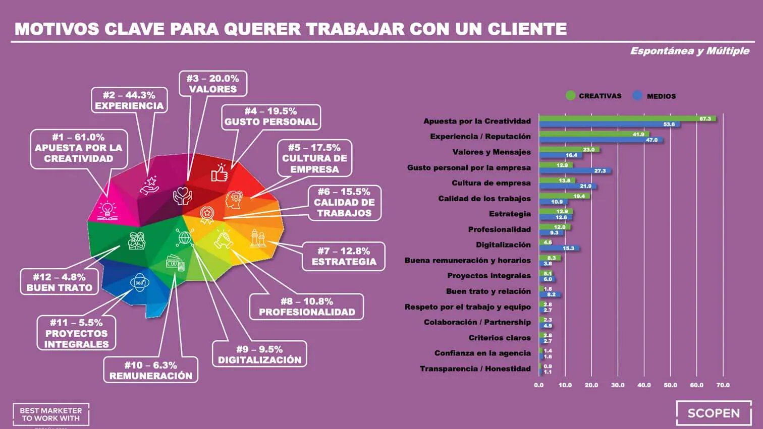 Los profesionales de agencias creativas dan más importancia a los aspectos que tienen que ver con la comunicación que hacen las marcas y la calidad de la misma; y para los de agencias de medios son más importantes aspectos como la reputación y la cultura de la empresa.